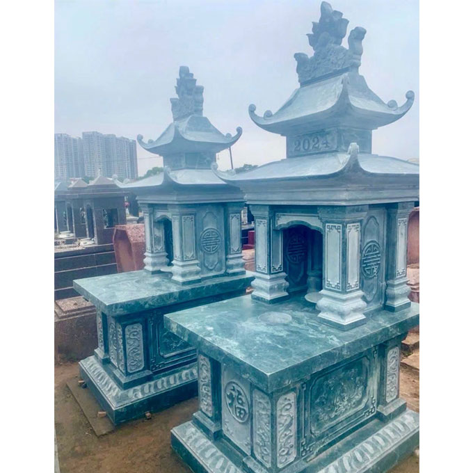Mộ 2 Mái Đá Xanh Rêu là một trong những mẫu mộ đá đẹp, mang đậm nét kiến trúc truyền thống Việt Nam. Được chế tác từ chất liệu đá xanh rêu tự nhiên nguyên khối, sản phẩm có độ bền vĩnh cửu theo thời gian, giữ được vẻ đẹp sang trọng và trang nghiêm cho không gian lăng mộ gia đình.