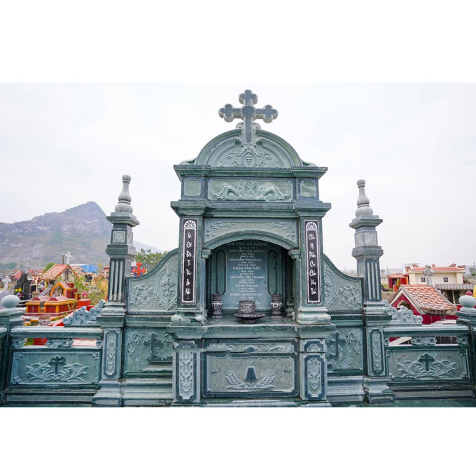 Dựa trên hình ảnh, mẫu mộ đá được chế tác từ đá xanh rêu tự nhiên nguyên khối, bền chắc với thời gian, chịu được mọi tác động của thời tiết. Các đường nét chạm khắc tinh xảo, sắc nét, từ hoa văn Công Giáo, cây thánh giá cho đến các họa tiết trang trí mang ý nghĩa linh thiêng.